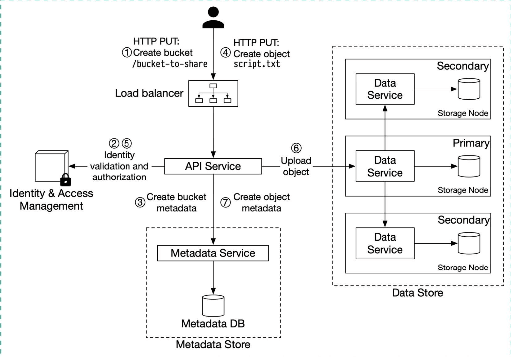1. A client sends an HTTP PUT request to create a bucket or an object within a bucket (e.g., /bucket-to-share/script.txt).