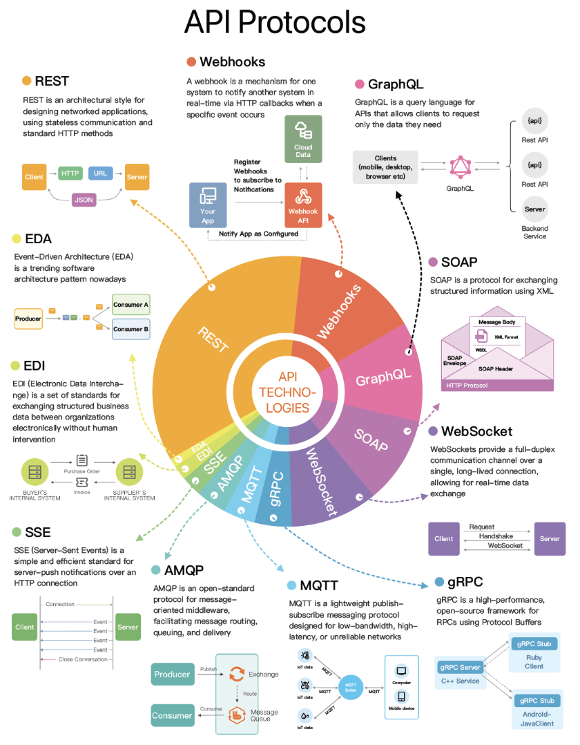 - How it works: Uses standard HTTP methods (GET, POST, PUT, DELETE, etc.), communicates statelessly, and resources are identified by URLs.