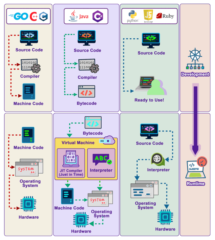 - Interpreted languages translate and execute code during runtime, offering great portability and often a faster development experience, but typically at a performance cost.