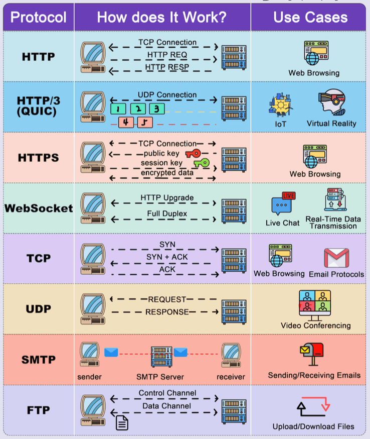 - Relies on application protocols (the rules of communication) like: