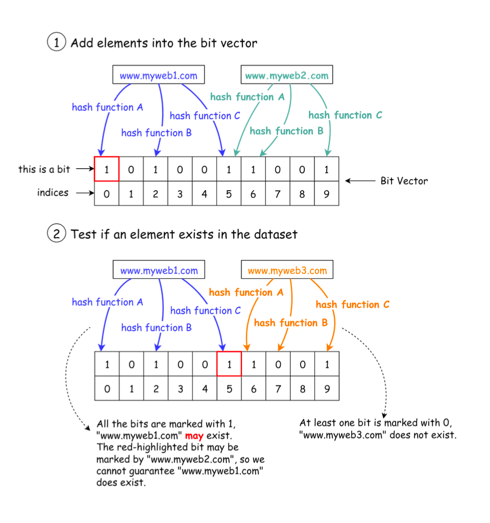 0: The URL has definitely not been seen before. The crawler can proceed to process it (and then add it to the filter). - If all of these bits are