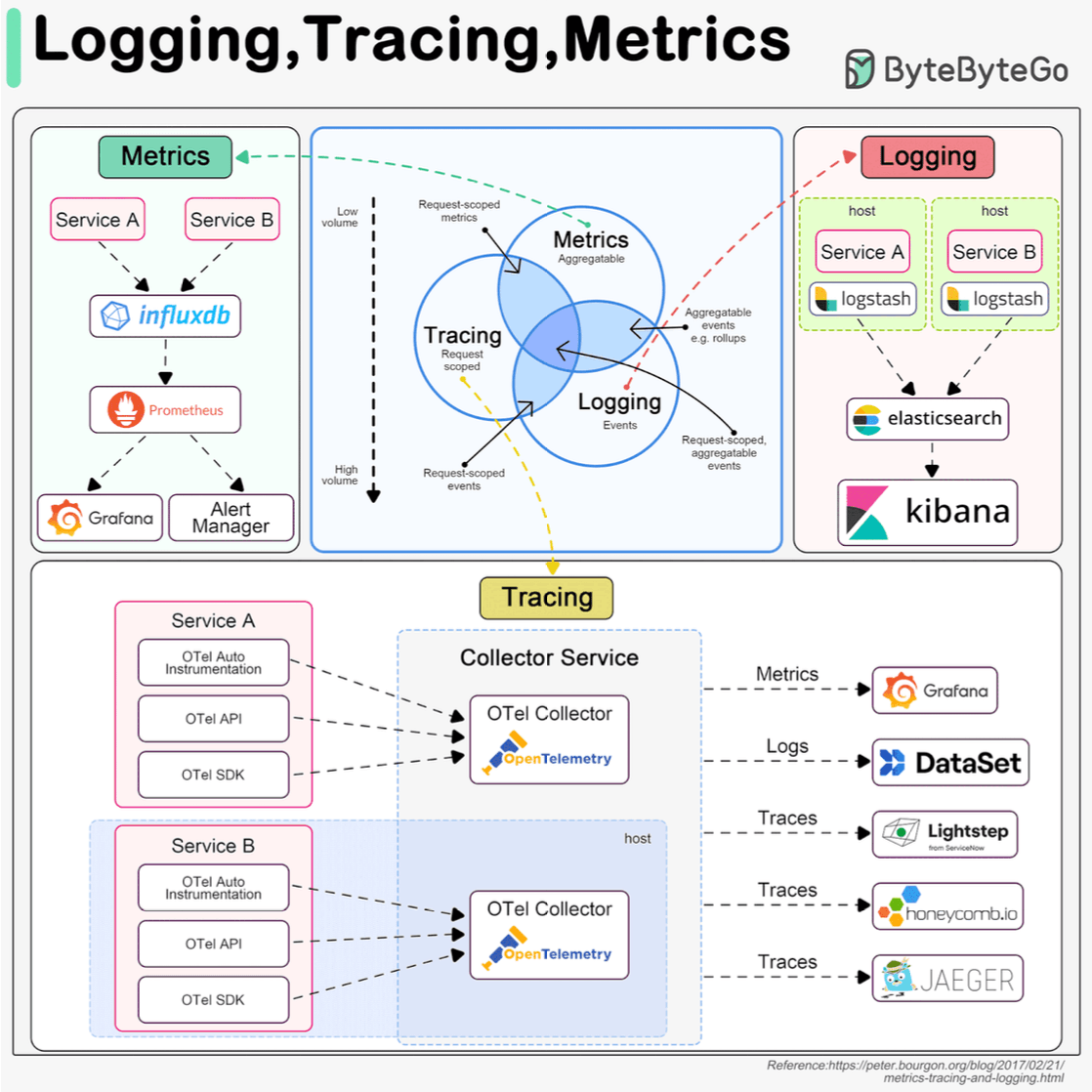 - Frameworks like OpenTelemetry aim to unify the collection and management of metrics, logs, and traces.