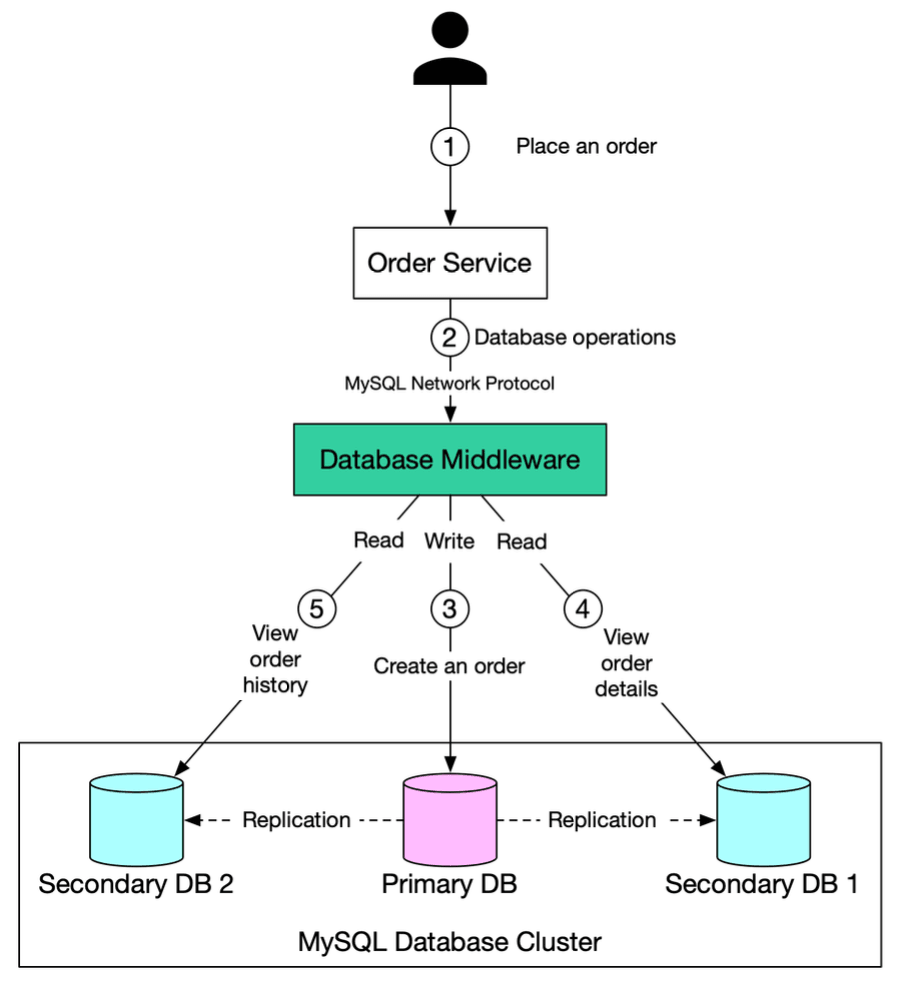 - The database middleware sits between your application services (like the Order Service) and your database cluster (primary + replicas).