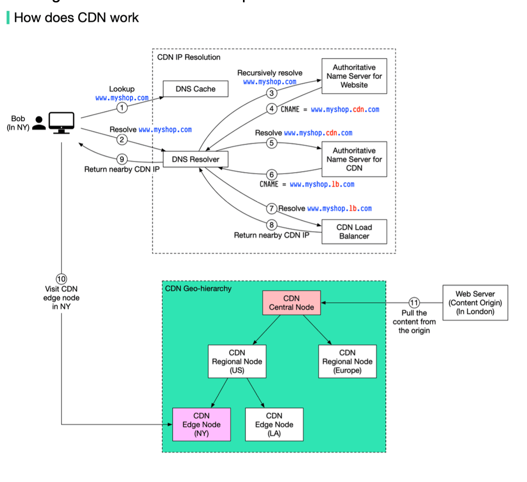 - How: CDNs cache static content (like images, videos, CSS, JavaScript files) at "edge locations" closer to end-users. When a user requests content, it's served from the nearest CDN edge server rather than the origin server. The DNS resolution process often involves routing the user to the optimal CDN edge server based on their location. If an edge CDN server cache doesn't contain the content, it goes upward to regional or central CDN servers, or even to the origin server.