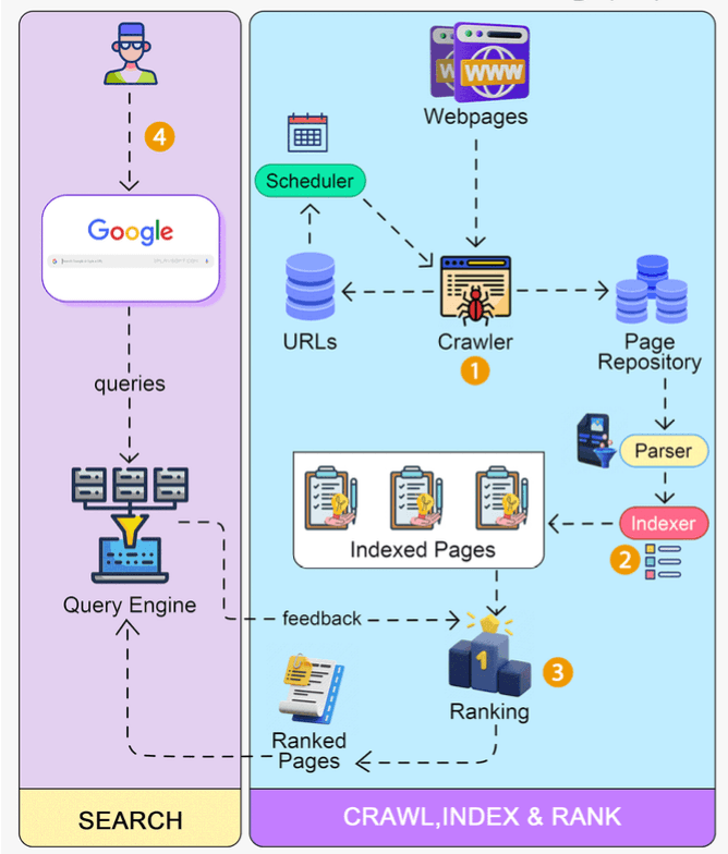 - User Input & Query Parsing: The user types their query into the search box. The search engine's web server receives this query.