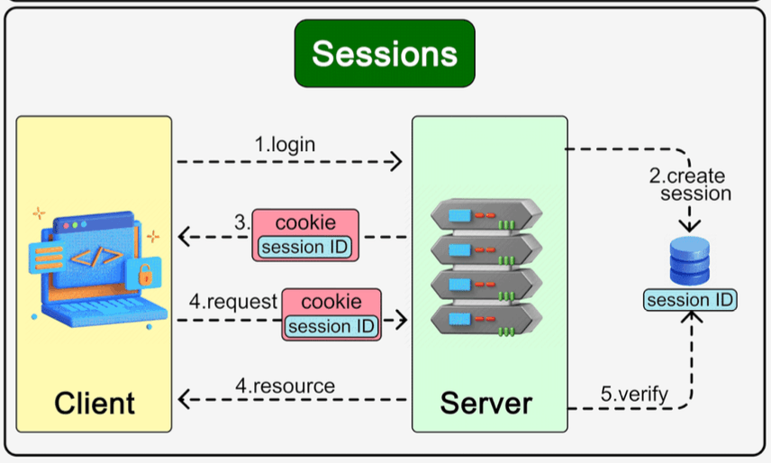 - When a user starts interacting with an application (e.g., logs in), the server can create a "session" to store information about that user's activity and state.