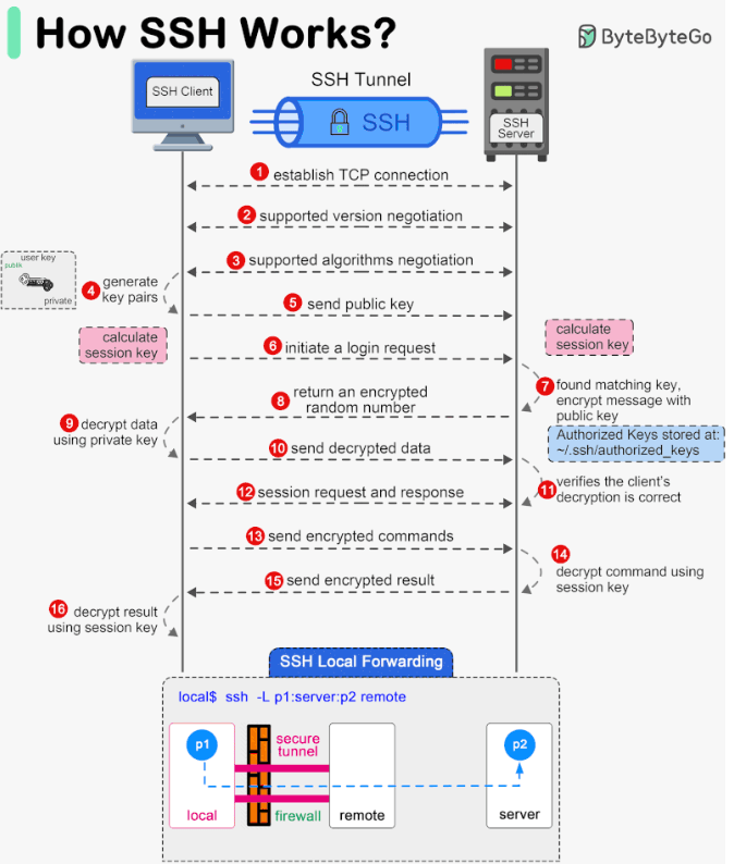 Establishing a secure SSH session involves a sophisticated handshake and negotiation process between the client and the server. Here’s a step-by-step breakdown:
