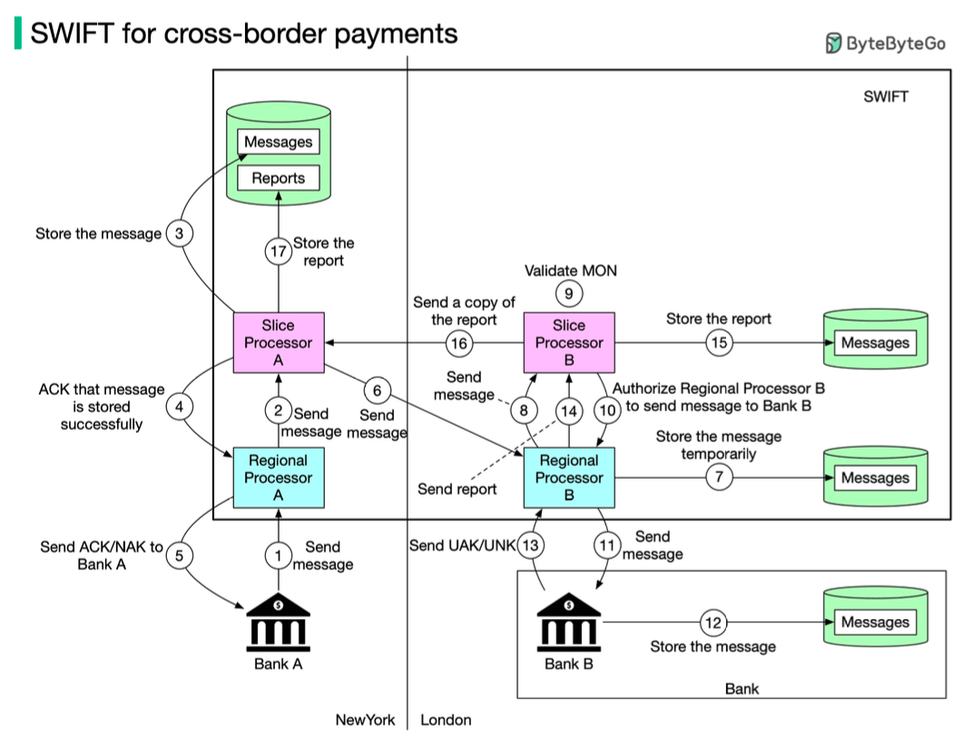 - Regional Processors in each bank's respective region (e.g., Regional Processor A in New York, Regional Processor B in London). These are responsible for input message validation and output message queuing.
