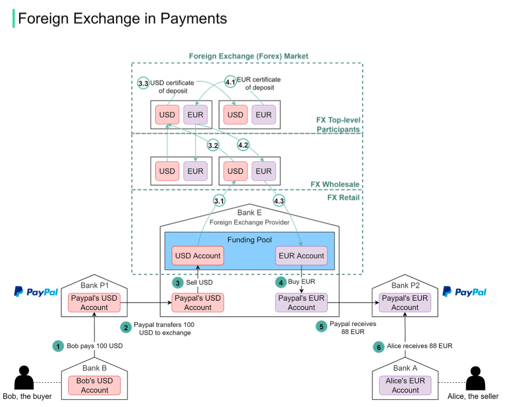 - In exchange, Bank E's funding pool provides the equivalent in EUR (say, 88 EUR after exchange rates and fees). This 88 EUR is then put into Paypal's EUR account, also likely held at Bank E.