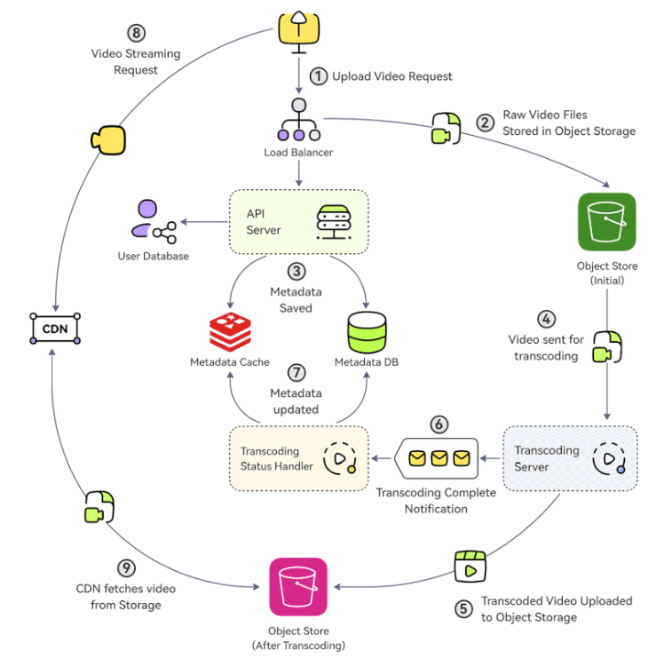 - Metadata Update: A "Transcoding Status Handler" service consumes this notification and updates the metadata database and cache with the status and locations of the newly transcoded video files.